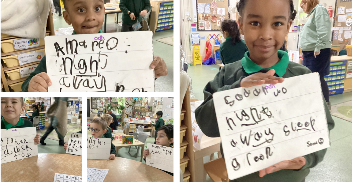 We are delighted that the children are now spelling words containing 'special friends' such as – sh, ck, th, qu, ay, ee, igh and ow!