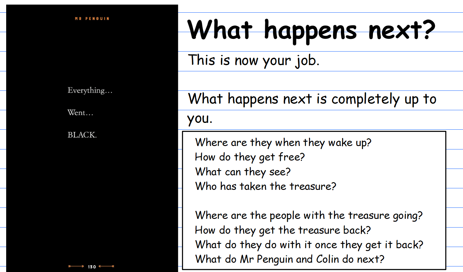 Challenge: Over the past week, we have been planning the conclusion of 'The Penguin and the Lost Treasure' in class. Could you think about and plan what is going to happen next after Mr Penguin was hit on the back of the head and 'Everything... Went... BLACK...'?