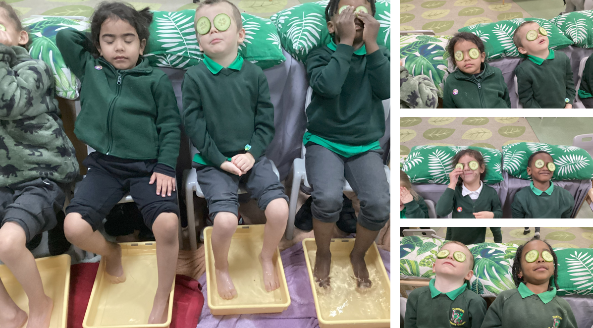 Relaxing music, soaking our feet with our choice of fragrance and cucumbers on our eyes...