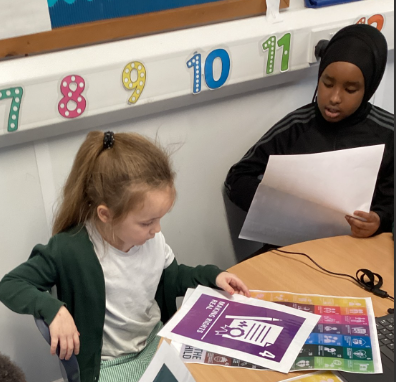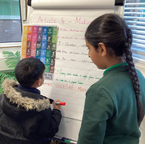 Our Rights Respecting School Ambassadors also support Mrs Abraham with our Rights Respecting assembly every Monday morning. We discuss the Article of the week and how it links to our school and learners in weekly classes. Then, we choose the most relevant article to match our assembly and talk about it in year groups. This helps our pupils and staff to have a deeper understanding of each of the rights. We add our thoughts to our RR/British Values flag in our classrooms.