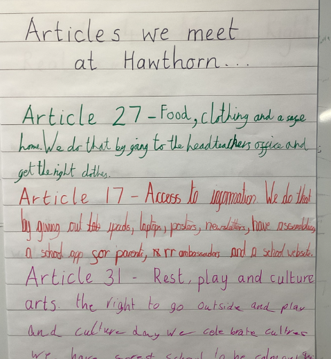 Welcome to our Rights Respecting Ambassadors page! The Rights Respecting Ambassadors at Hawthorn Primary School meet weekly to discuss ideas to support the well-being and welfare of children in school and ways to raise money for not only our school but also the wider community and globally.